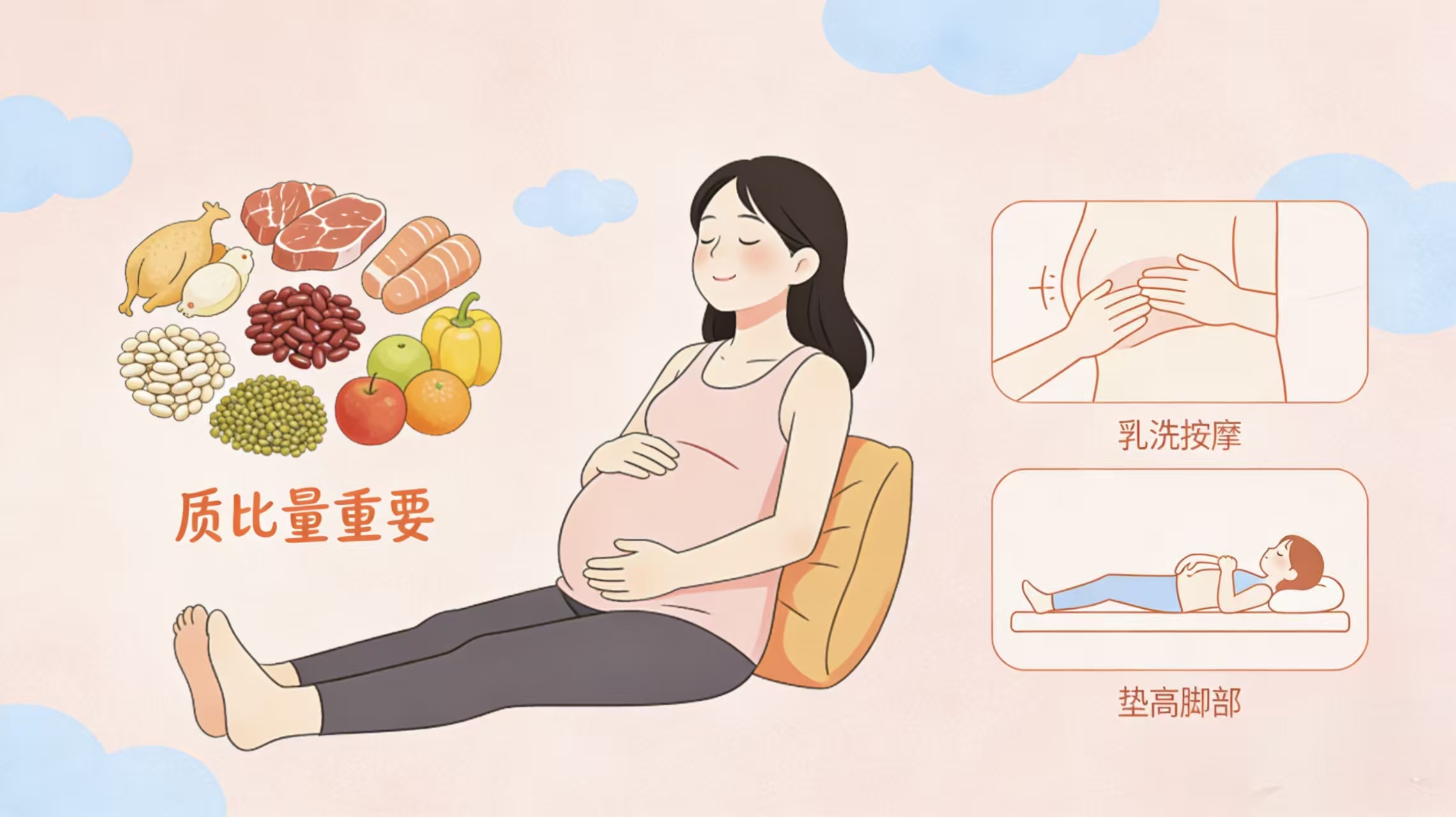 这一时期要学会腹式呼吸,它可以将充足的氧气输送给胎儿。正确的姿势是:背后靠一小靠垫,把膝盖伸直,全身放松,把手轻轻放在肚子上。然后开始做腹式呼吸,用鼻子吸气,直到肚子膨胀起来;吐气时,把嘴缩小,慢慢地、有力地坚持到最后,将身体内的空气全部吐出注意吐气的时候要比吸气的时候用力,慢慢地吐,每天做三次以上。另外要进行乳房清洗、按摩,保证乳房健康。此期孕妇脚容易浮肿,睡觉时,最好把脚稍微垫高一些。